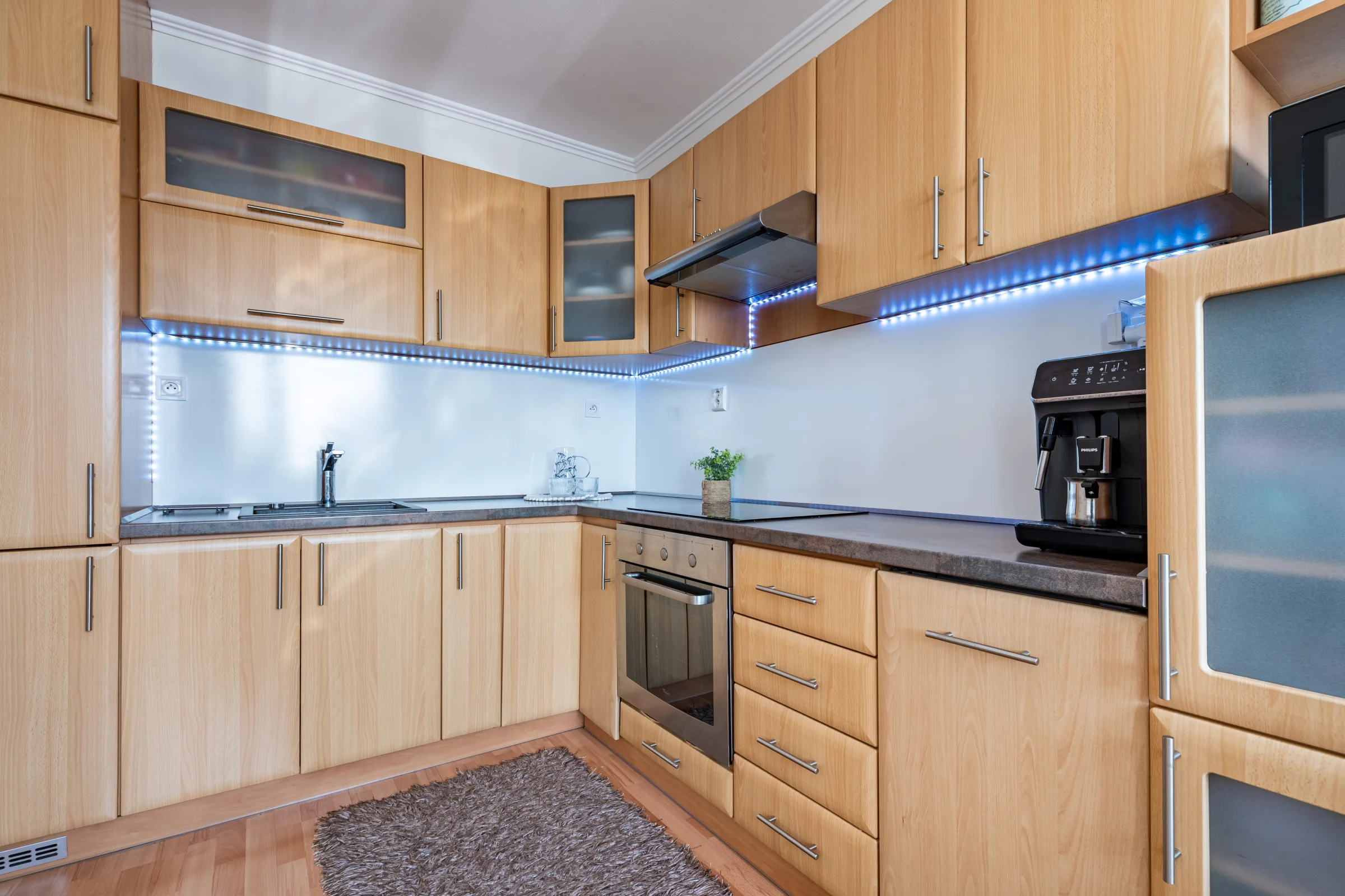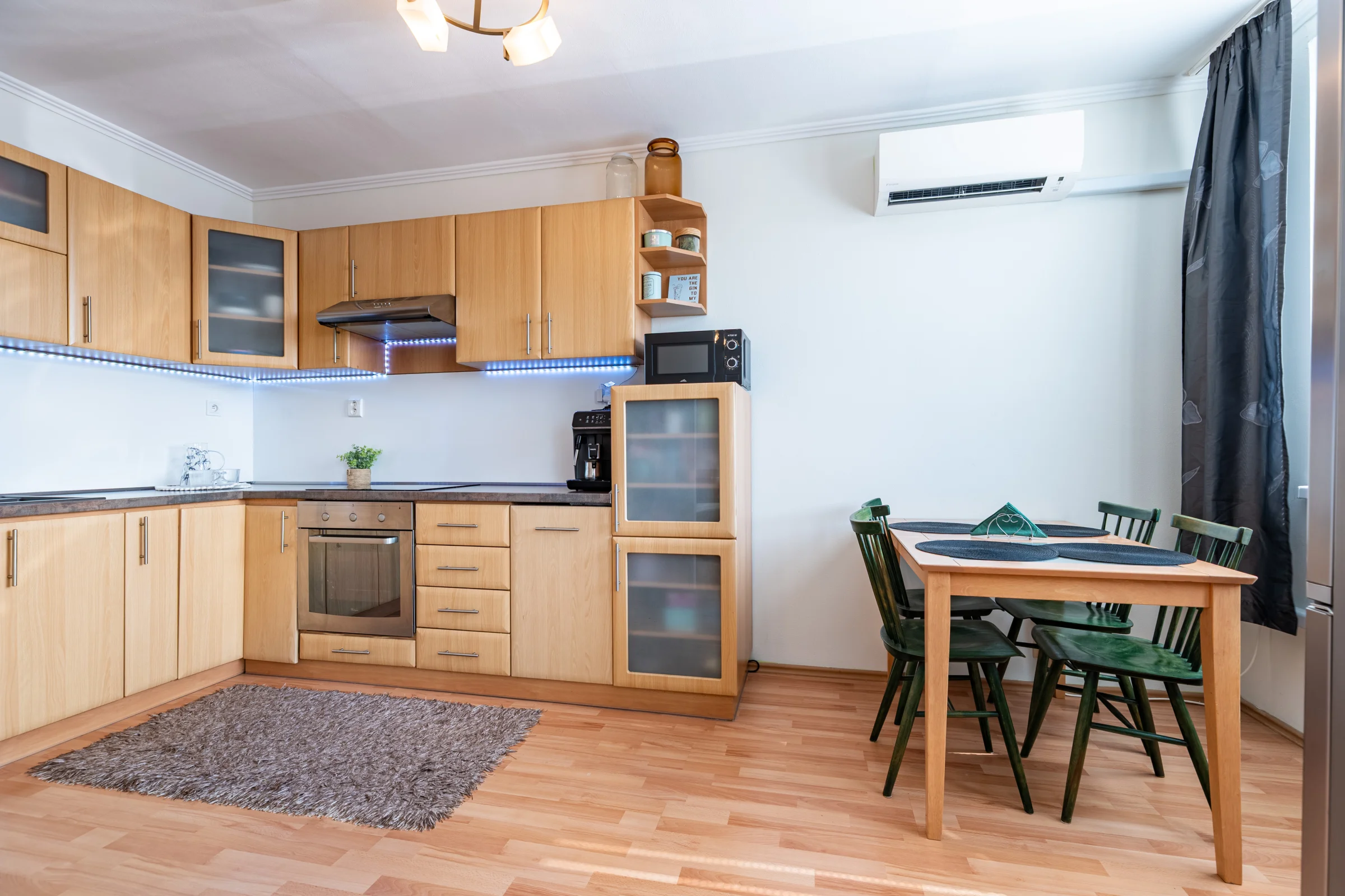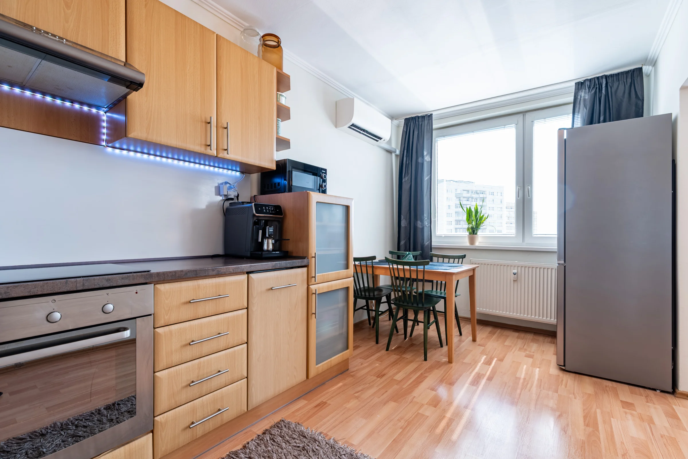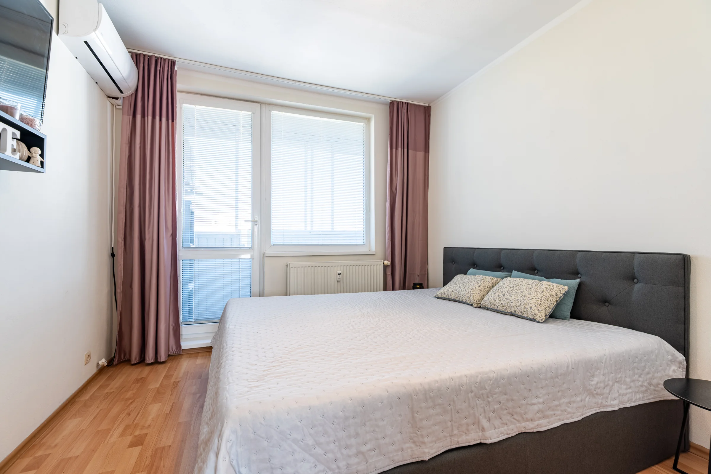 Byt prešiel kompletnou rekonštrukciou približne pred 10 rokmi, vrátane nových rozvodov vody, odpadu a elektroinštalácie. Vybavený je dvoma klimatizačnými jednotkami v obývačke a spálni. Dispozícia zahŕňa vstupnú chodbu, obývaciu izbu prepojenú s kuchyňou, spálňu s výstupom na lodžiu, detskú izbu, kúpeľňu a samostatné WC. V kuchyni sú zabudované spotrebiče – umývačka riadu, indukčná varná doska, elektrická rúra a digestor. Kompletne vybavená kuchynská linka má veľkú pracovnú plochu a množstvo odkladacieho priestoru. V kuchyni je aj priestor na jedálenskú časť. V byte sú na mieru zhotovené nábytky a skrine v chodbe a detskej izbe. Byt je v výbornom stave, nevyžaduje žiadne ďalšie investície.